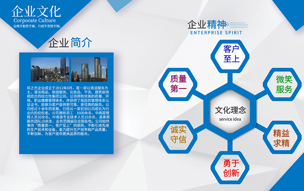 公司是一家以清潔服務(wù)為主,旅游,干洗、化妝品、裝修和餐飲相結(jié)合的多元化發(fā)展運(yùn)營(yíng)的服務(wù)性企業(yè)。企業(yè)本著誠(chéng)信第一、服務(wù)至上的原則,依靠公司盡我所能、力我所及的信條從2012年到現(xiàn)在服務(wù)了多家企業(yè),現(xiàn)在我們已經(jīng)擁有了400家左右的清潔服務(wù)項(xiàng)目和多家洗衣店。我們會(huì)一直牢記服務(wù),創(chuàng)新才是我們企業(yè)發(fā)展的服務(wù)宗旨。